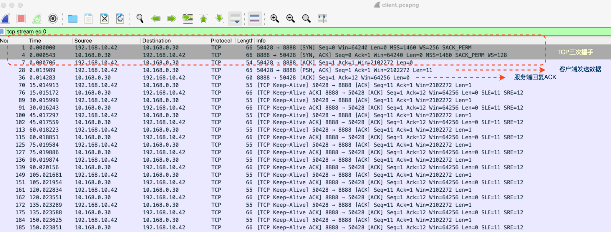 我们尝试建立10个连接,所以tcp的数据流也只会有10个,一个数据流包含n个数据包,可以通过 tcp.stream eq 0 ~ tcp.stream eq 9在wireshark中进行过滤。